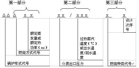 第一部分:表示鍋爐型式,燃燒方式和額定蒸發(fā)量或額定熱功率。共分三段: